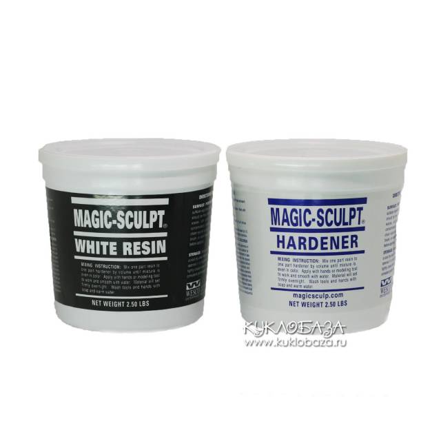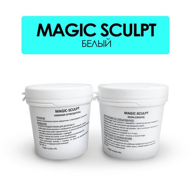 Эпоксидный двухкомпонентный пластик, застывает на воздухе. Смешанный пластик гибкий и эластичный. Белый мэджик скульпт в смешанном виде чуть более мягкий и липкий, чем серый.